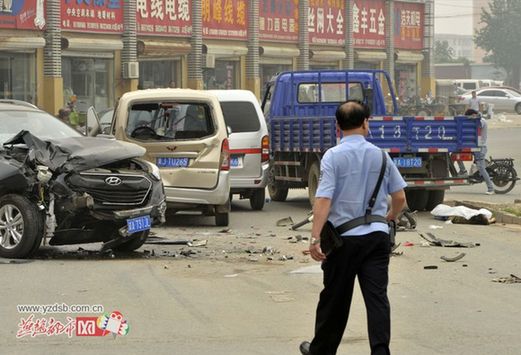中午1点前后,107国道东侧润德五金城门口发生一起三车连撞事故,事故造成一骑电动车男子当场身亡,电动车上一名五、六岁女孩重伤。事故中,两辆追尾的面包车司机受伤,另一辆现代越野车前脸受损严重,气囊打开……裕华交警大队事故科警员正在现场调查。目前死者身体覆盖白单,身份未明……燕赵都市网记者郭天力陈建宇发自车祸现场
