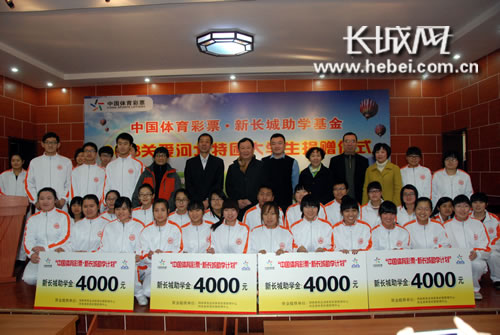 “中国体育彩票·新长城助学基金”由国家体彩中心与中国扶贫基金会于2005年合作设立,先后资助了20余个省区市的大学生,捐款总额累计达到369.4万元,共有1847人次大学生从中受益。今年河北、河南、黑龙江等6个省市的250名贫寒学子得到了中国体育彩票的捐助。