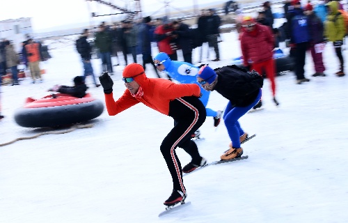 海晏(青海),2013年12月28日 (体育)(3)全民健身——天然冰场上的“快乐运动会” 12月28日,几名户外运动爱好者正在滑冰。 当日,以“健康运动、快乐向上”为主题的金银滩冰上运动会在青海省海北藏族自治州海晏县东大滩举行。超过200名户外运动爱好者在湿地形成的天然冰场上享受冰上运动带来的快乐。